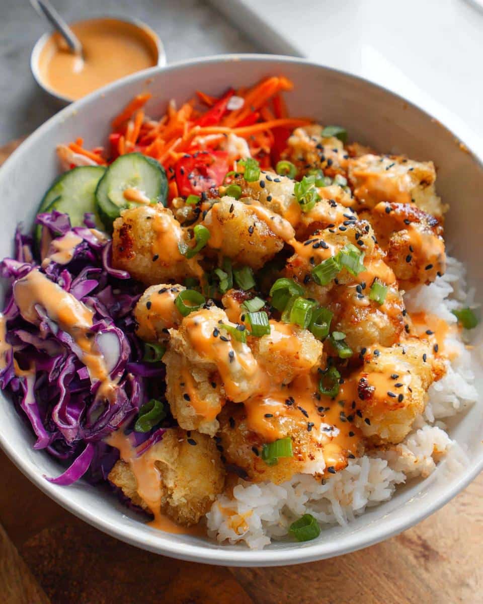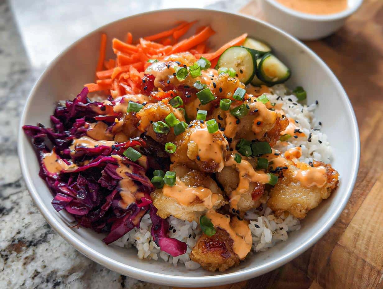 Make a quick and flavorful Bang Bang Chicken Bowl with crispy chicken, fresh vegetables, and a spicy-sweet sauce served over jasmine rice.
