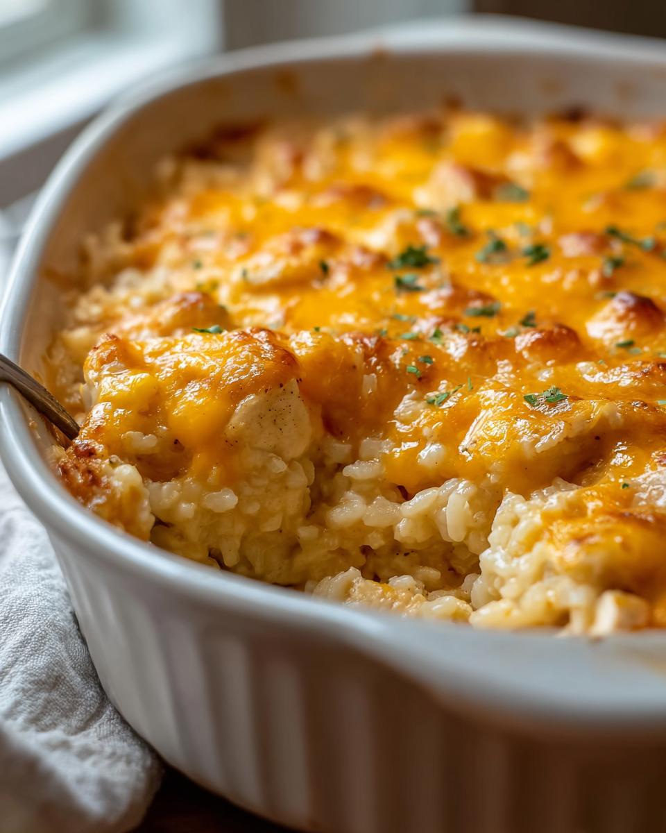 Keywords: cheesy chicken rice casserole, comfort food, baked casserole, easy dinner, family meal