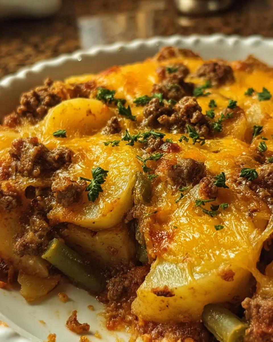 A simple and hearty one-pan casserole featuring ground beef, potatoes, and green beans, topped with melted cheddar cheese.