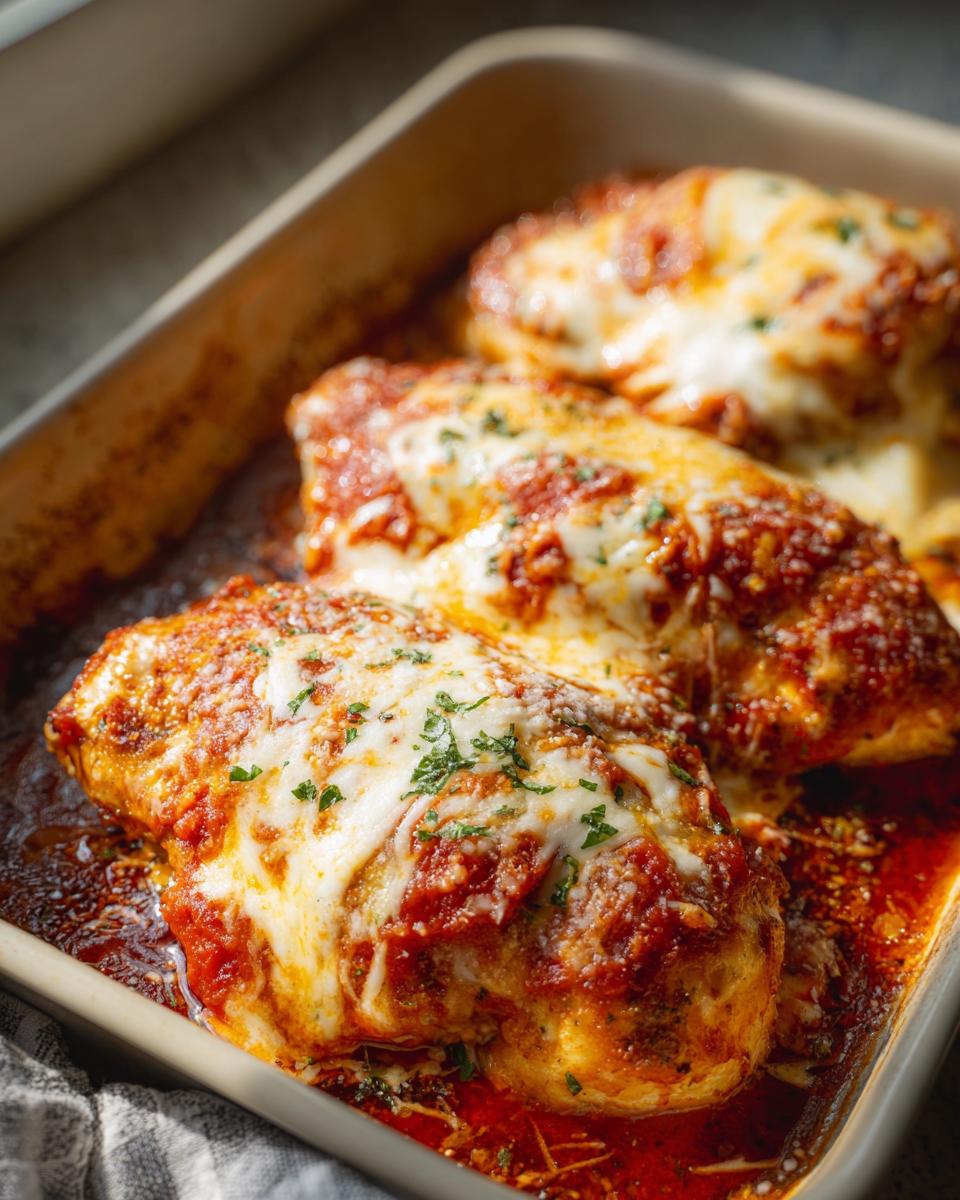 A simple and delicious baked chicken dish inspired by classic Chicken Parmesan, featuring marinara sauce, melted mozzarella, and Parmesan cheese.