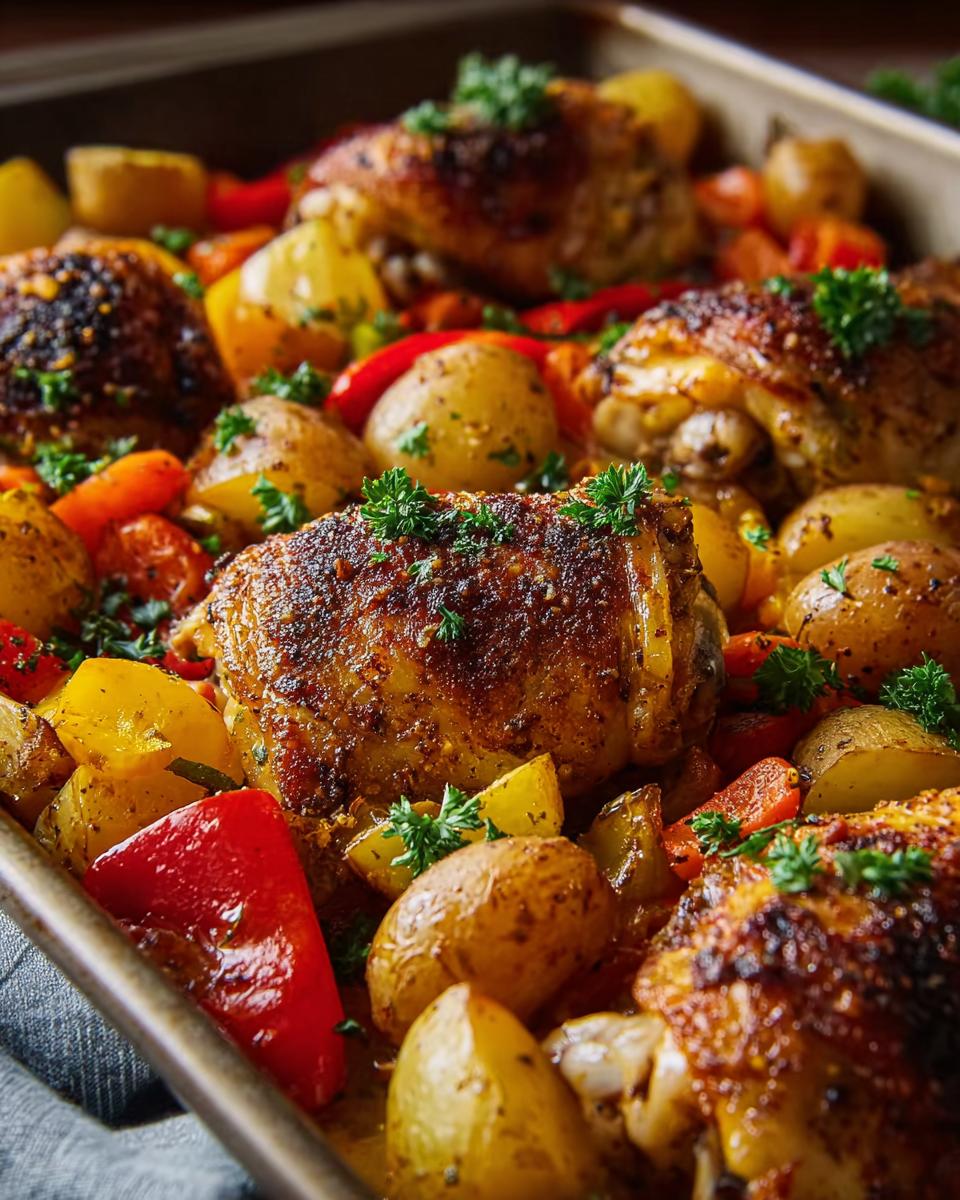 A close-up shot of a baking sheet filled with golden brown roasted chicken thighs, small potatoes, and colorful bell peppers, garnished with fresh parsley.