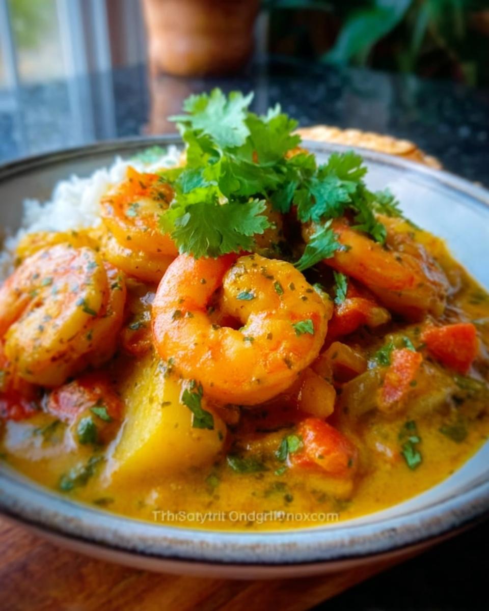 A creamy, spiced seafood dish featuring plump shrimp, fragrant curry, and rich coconut milk, ready in 30 minutes.