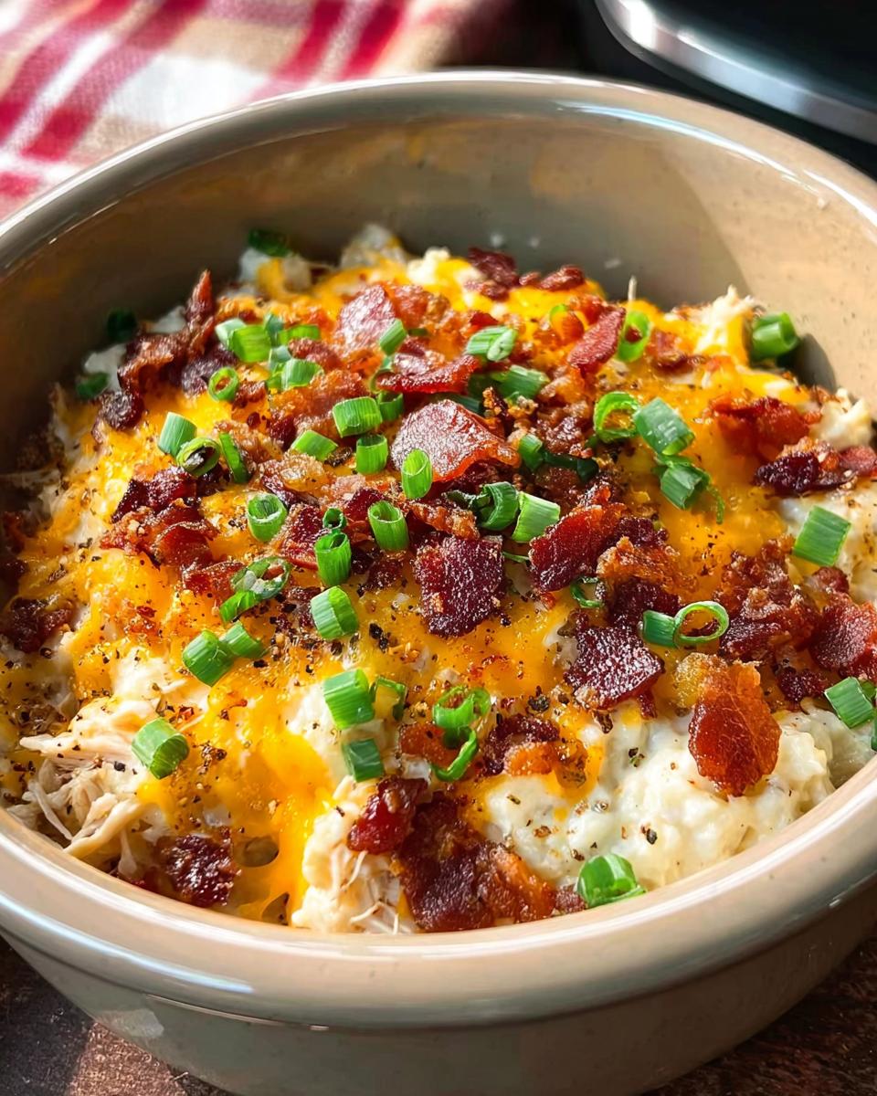 A creamy, cheesy slow cooker chicken recipe with bacon and cheddar cheese, perfect for a flavorful dinner bowl.