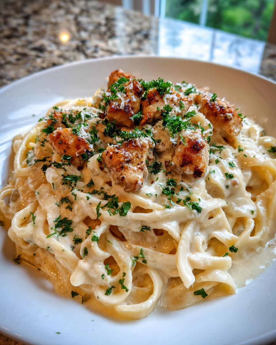 Itโs time for the grand finale! Take your cooked chicken waiting on the plate and drop it right back into that lush sauce. Give it a quick stir, and then sprinkle in your salt and pepper. Now, add all that warm cooked pasta right into the skillet. Gently toss everything togetherโI mean *gently*โuntil every last piece of pasta and chicken is completely coated in that glorious, thick sauce. Serve it up immediately while itโs hot, and donโt forget that sprinkle of fresh parsley on top for a little color!