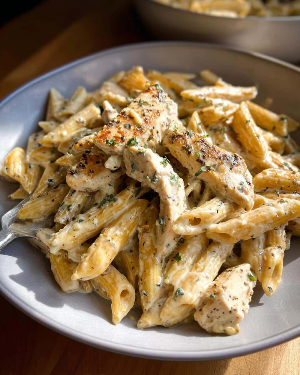 A close-up of penne pasta coated in a rich, creamy garlic parmesan sauce with sliced grilled chicken.