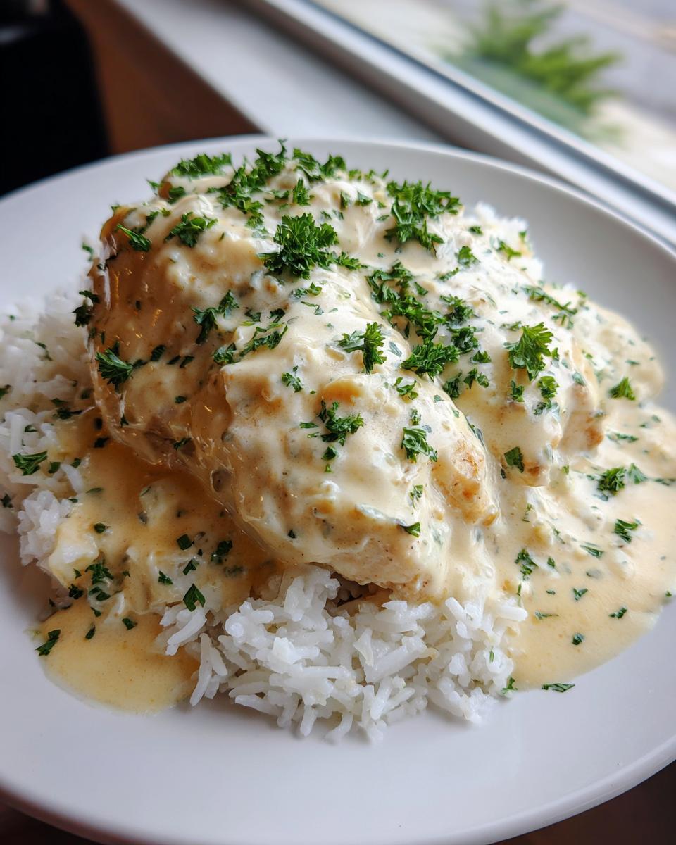 A recipe for tender chicken smothered in a rich, creamy sauce served over rice.