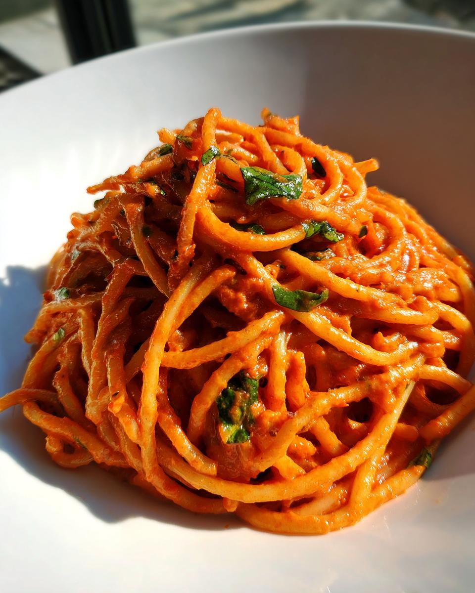 A tall mound of spaghetti coated in a rich, creamy tomato basil pasta sauce, garnished with fresh herbs.