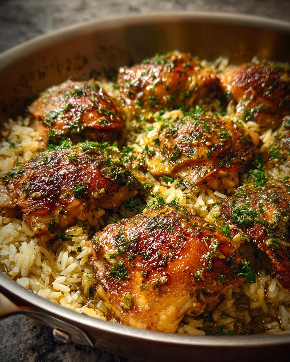 A simple and flavorful one-pot meal featuring tender chicken thighs and fluffy rice infused with garlic and herbs.