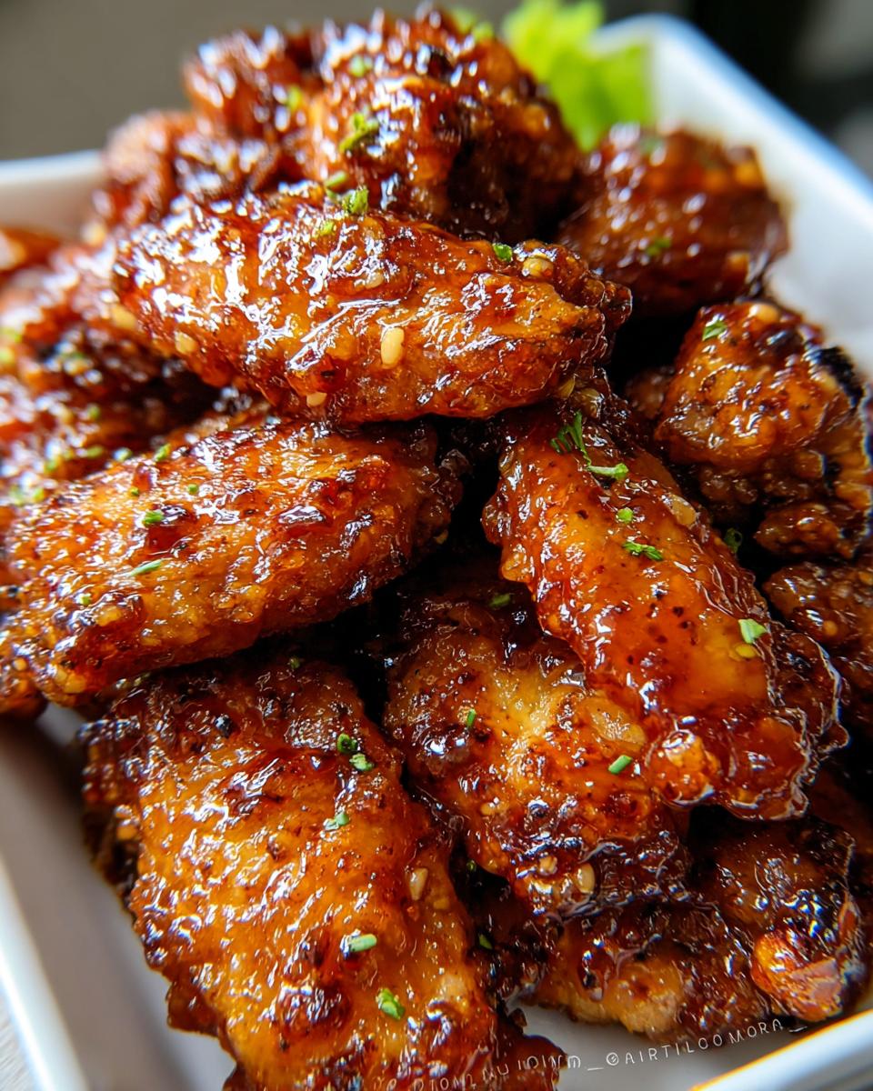 Close-up of a pile of glistening Honey Garlic Wings coated in a sticky glaze and sprinkled with herbs.
