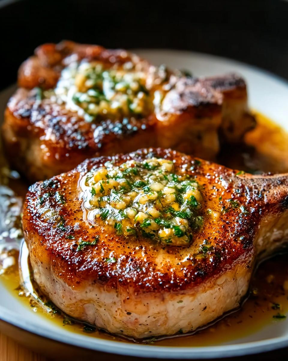 Close-up of juicy pan seared pork chops topped with melted garlic butter and fresh herbs.