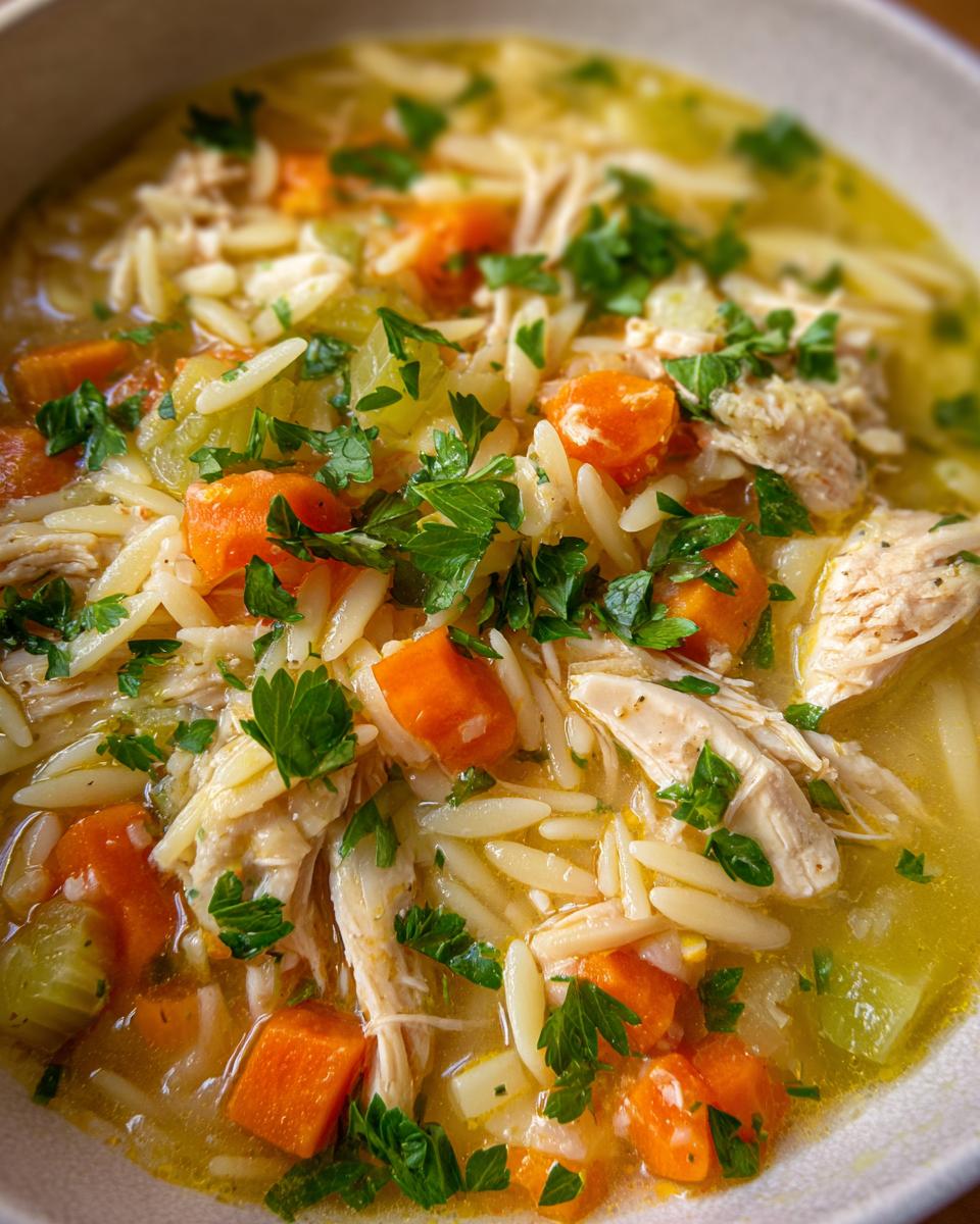 Now for the pasta โ I absolutely love using orzo for this soup. It’s like little rice-shaped pasta friends that soak up all that lovely broth. You’ll need about half a cup of that. And of course, the stars of the show: 1/4 cup of fresh lemon juice. Please, please, please use fresh lemon juice! Bottled just doesn’t have that same zing. Finish it all off with 2 tablespoons of fresh parsley, chopped up for a burst of freshness and color right at the end. And you can’t forget salt and black pepper to taste, because even the simplest soup needs its seasoning!