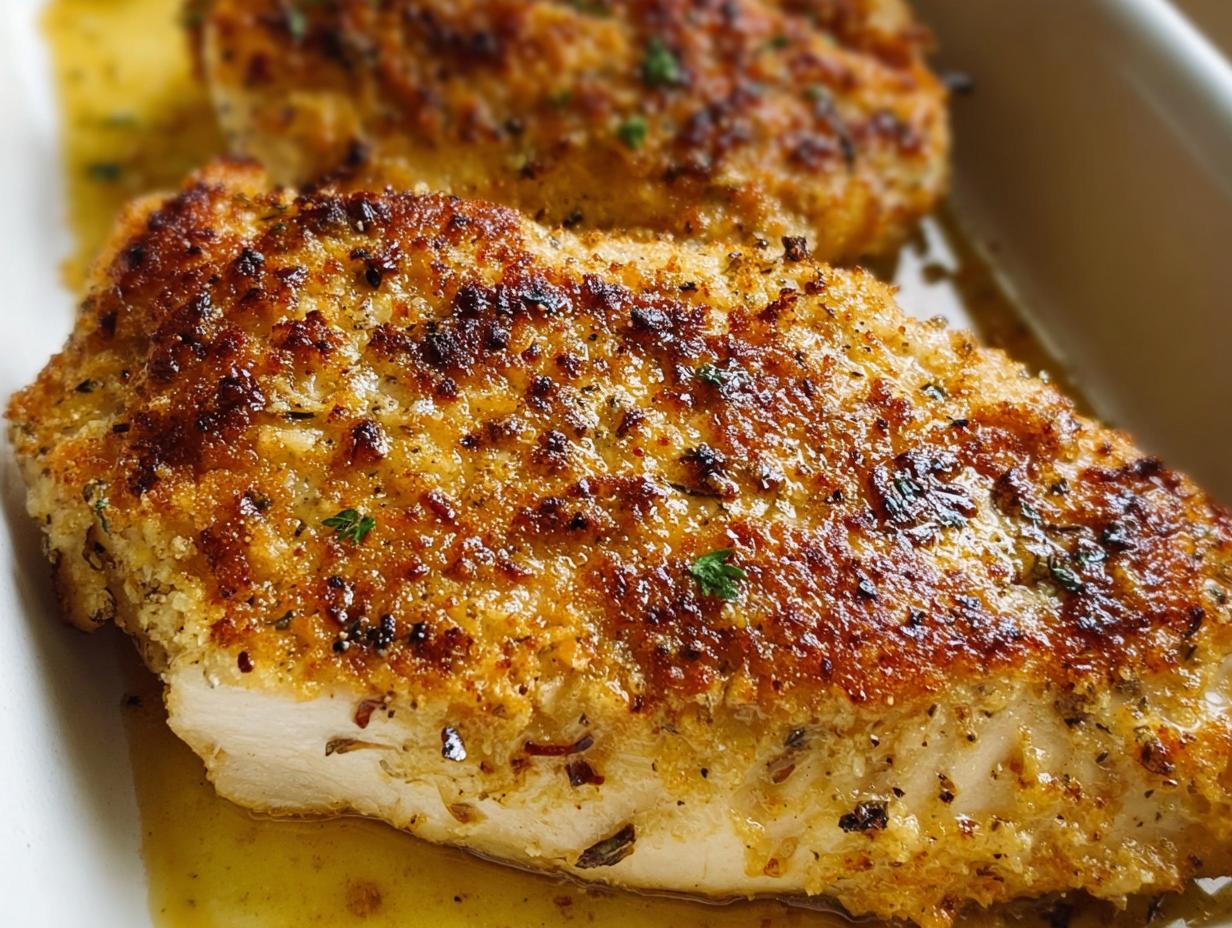 A simple recipe for oven-baked chicken breasts topped with a creamy Parmesan crust, resulting in tender and juicy meat.