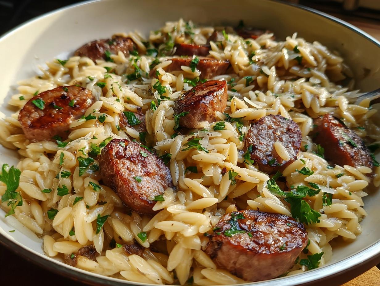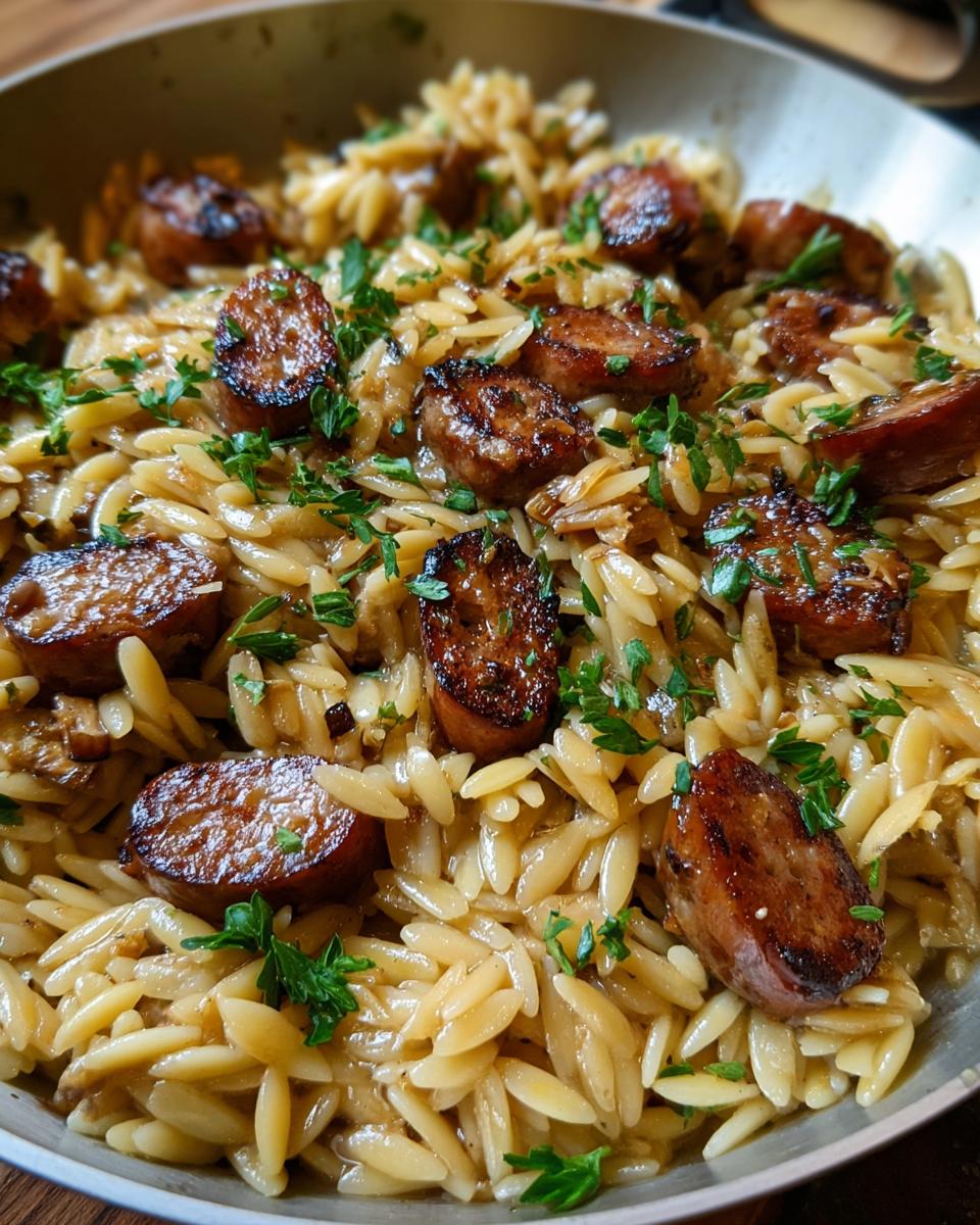A quick and easy one-pot meal featuring sausage, orzo, and a creamy garlic butter sauce, perfect for busy weeknights.