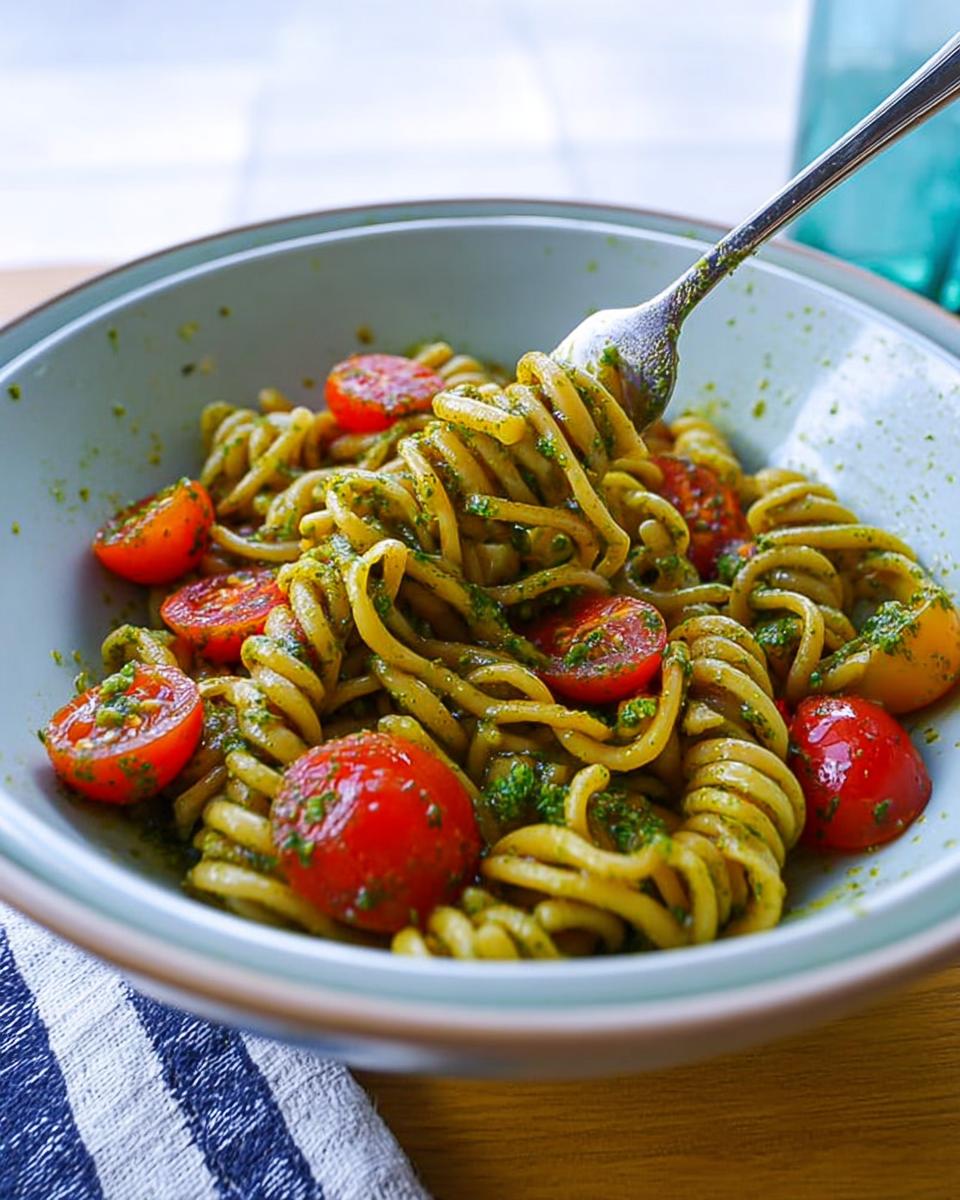 A simple recipe for fresh pesto pasta tossed with cherry tomatoes, ready quickly for a light meal.