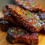 Close-up of glazed tempeh pieces, a great addition to Protein-Packed Lunch Boxes, on a wooden board, garnished with herbs.