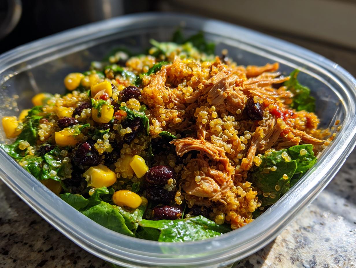 - Combine the shredded chicken, quinoa, black beans, corn, and red onion in a medium bowl.