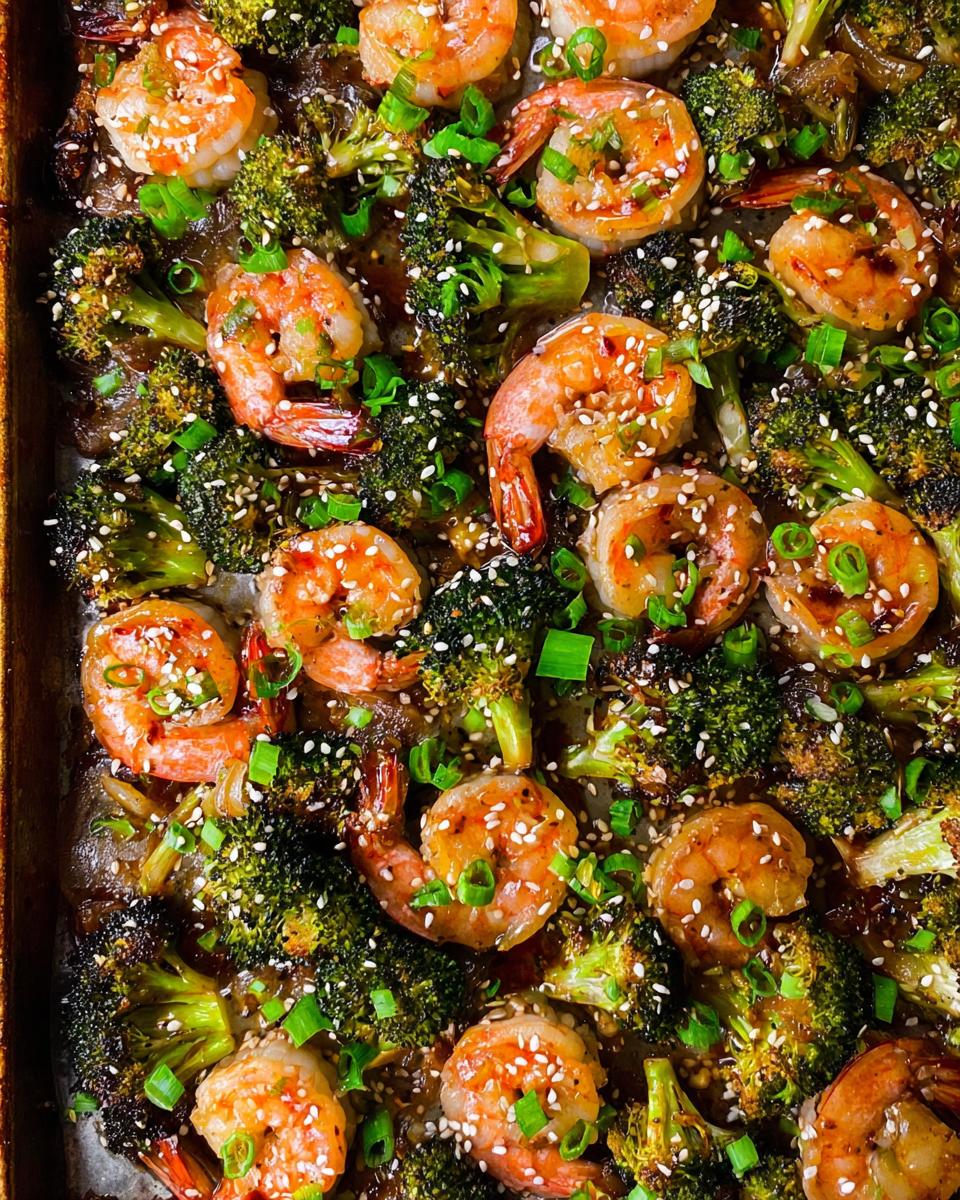 When the timer dings after the broccoli bake, pull that pan out carefully. Now, toss those jumbo shrimp right on there! Pour *half* of the remaining sauce over the shrimp—don’t forget to reserve the very last bit for drizzling at the end! Toss it gently so it’s spread into one nice, even layer. Back into the oven they go, but this time it’s fast! You only bake for about 5 to 6 minutes. You’ll know they are done because the shrimp quickly shock from that sleepy gray-blue color to a happy, opaque pink. That’s your cue! Pull it out, sprinkle on those sesame seeds and green onions, and enjoy immediately!