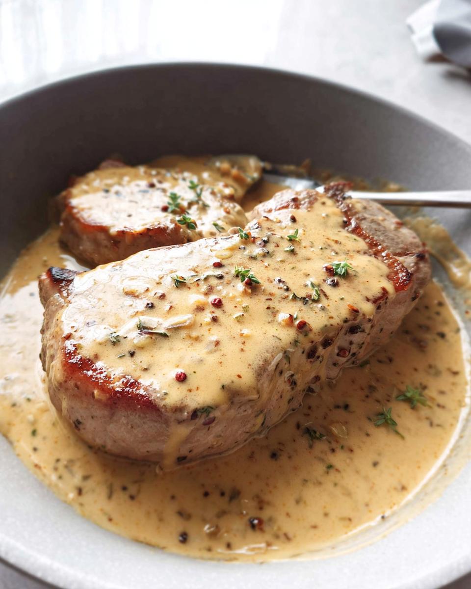 Tender pork chops seared and finished in a rich, creamy Dijon sauce, baked to perfection.