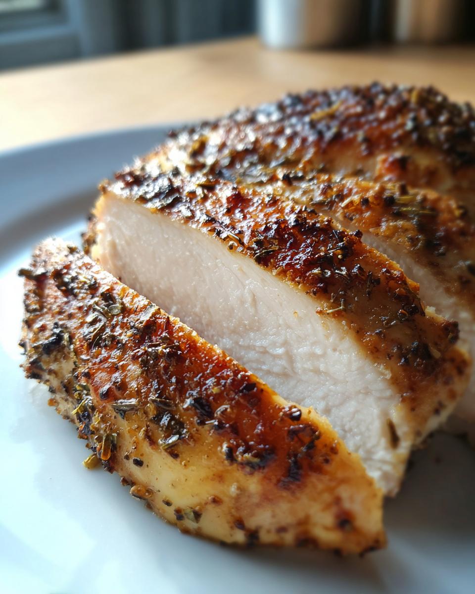 Close-up of perfectly cooked, sliced herb-roasted chicken breast, ideal for what to cook for dinner tonight.